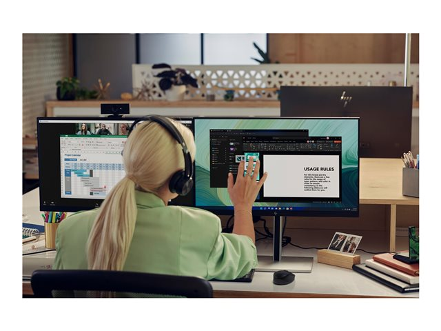 - När en intensiv arbetsdag kräver bästa möjliga komfort är det lätt att hitta den med justering i fyra riktningar som optimeras med hjälp av guiden för ergonomisk montering. Håll ögonen bekväma med en skärm som filtrerar bort blått ljus med HP Eye Ease – nu även förbättrad med en uppdateringsfrekvens på 75 Hz.