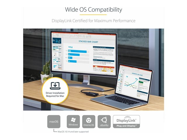 • DisplayLink 4K Plug-and-Display-certifierad - automatisk installation och uppdatering av drivrutiner